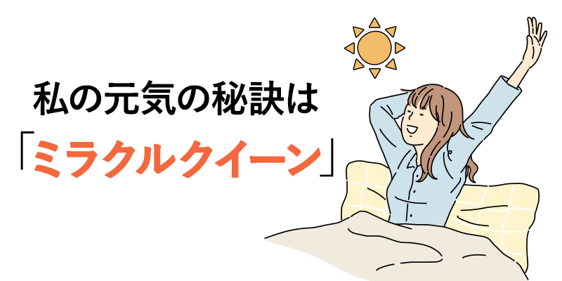 ミラクルクイーンをずっと愛⽤しているので、忙しい⽇々の健康維持や年齢に負けない体づくりもできています。プレゼントの企画や三ツ星北海道など⼀緒に送られてくるのも楽しみの⼀つとなっています。これからもよろしくお願いいたします。